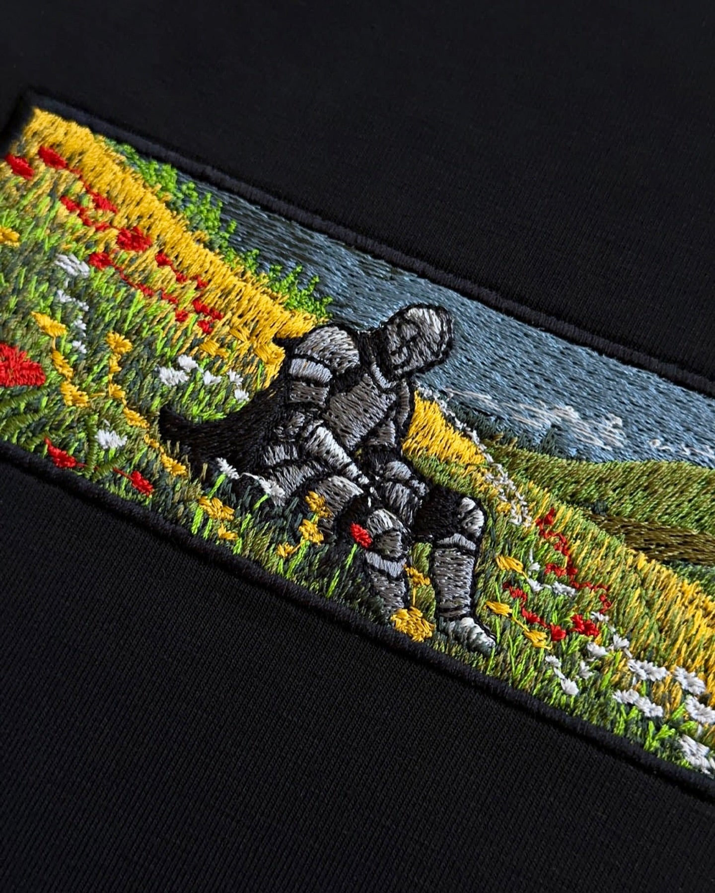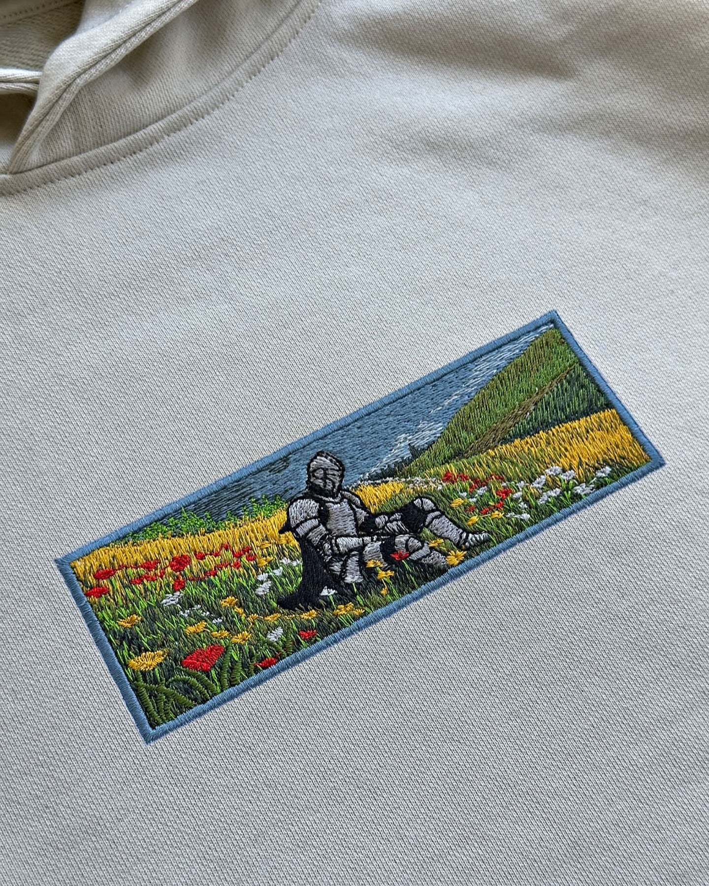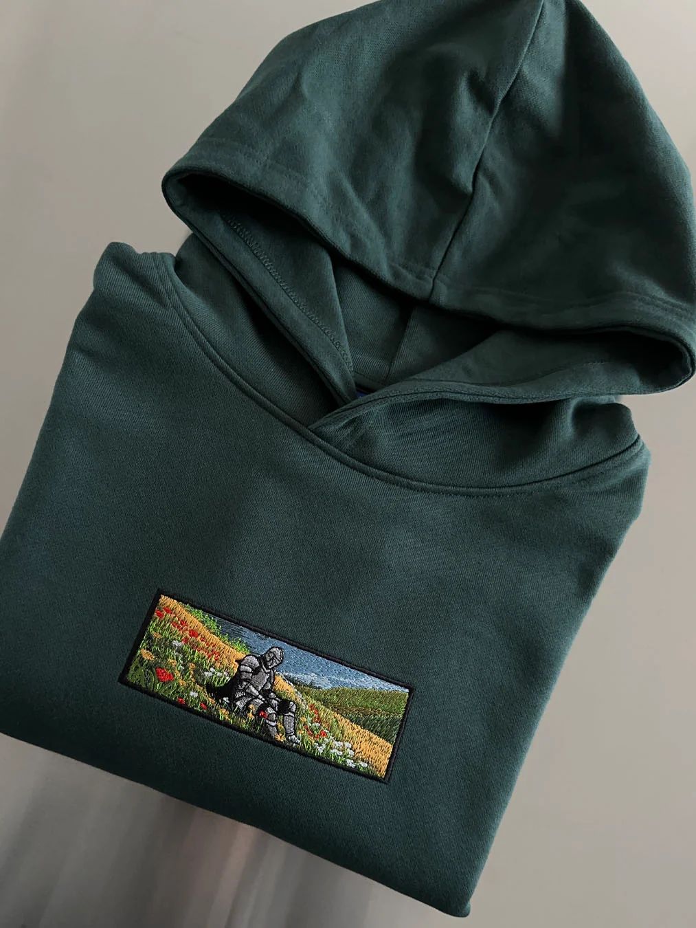 Découvrez le Hoodie “Le Chevalier en Paix”, une pièce d’exception qui fusionne art, symbolisme et confort. La broderie minutieuse représente un chevalier reposant dans un champ fleuri — une image puissante de force et de sérénité.